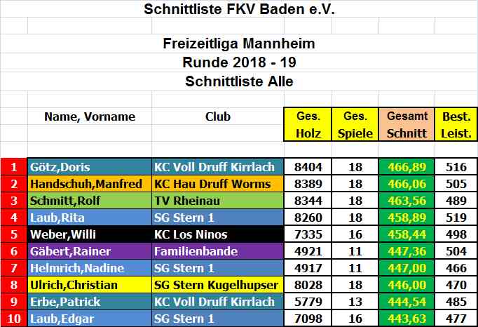Bester Spieler*in der Runde ist Doris mit einem Schnitt von 466,89, vor Manfred 466,06 und Rolf mit 463,56 Holz. Manfred mit einem Schnitt in der Rückrunde von 474,11 spielte sich von Platz 4 in der Vorrunde noch auf Platz2.